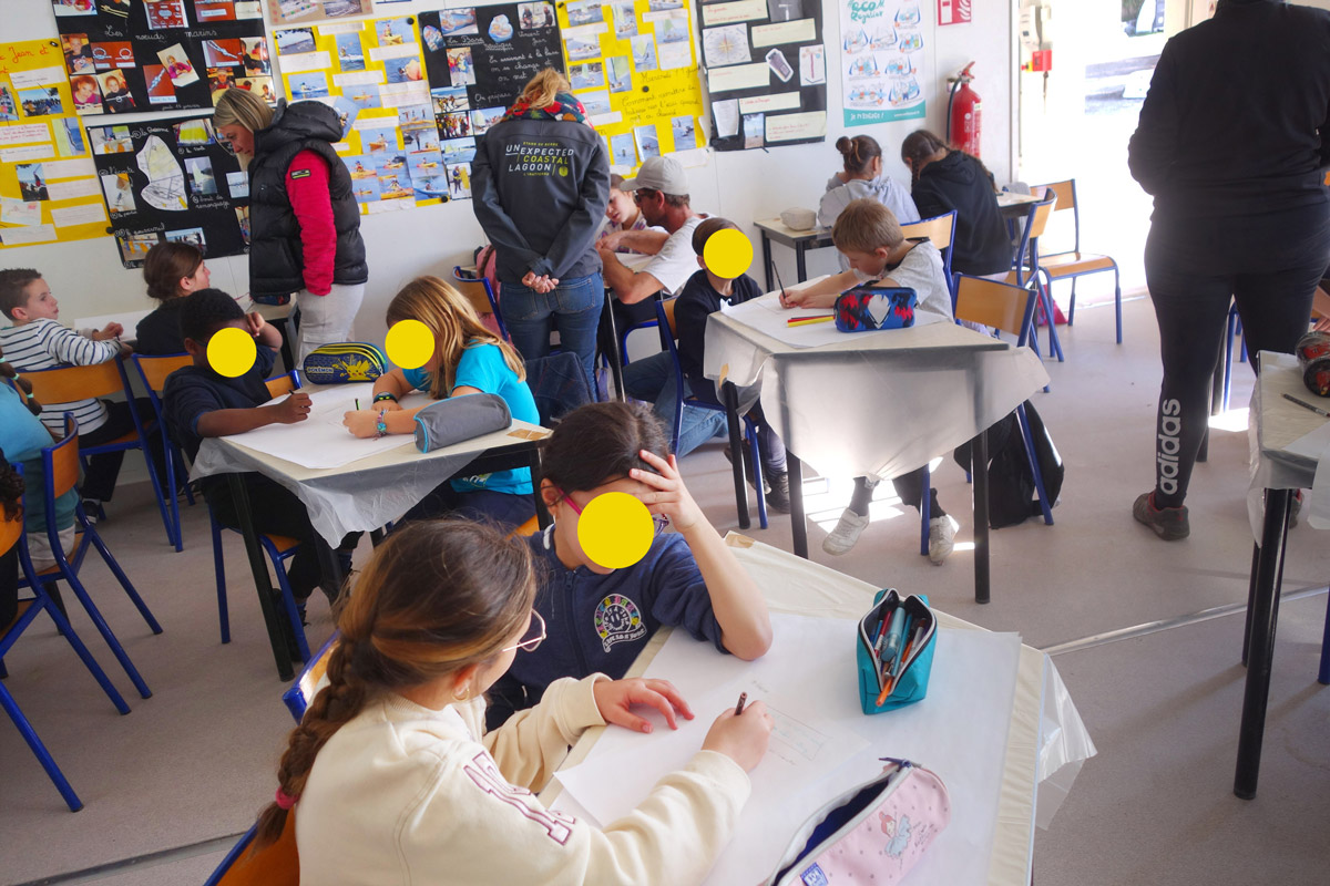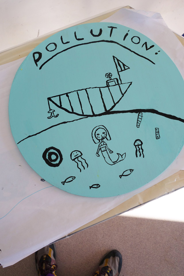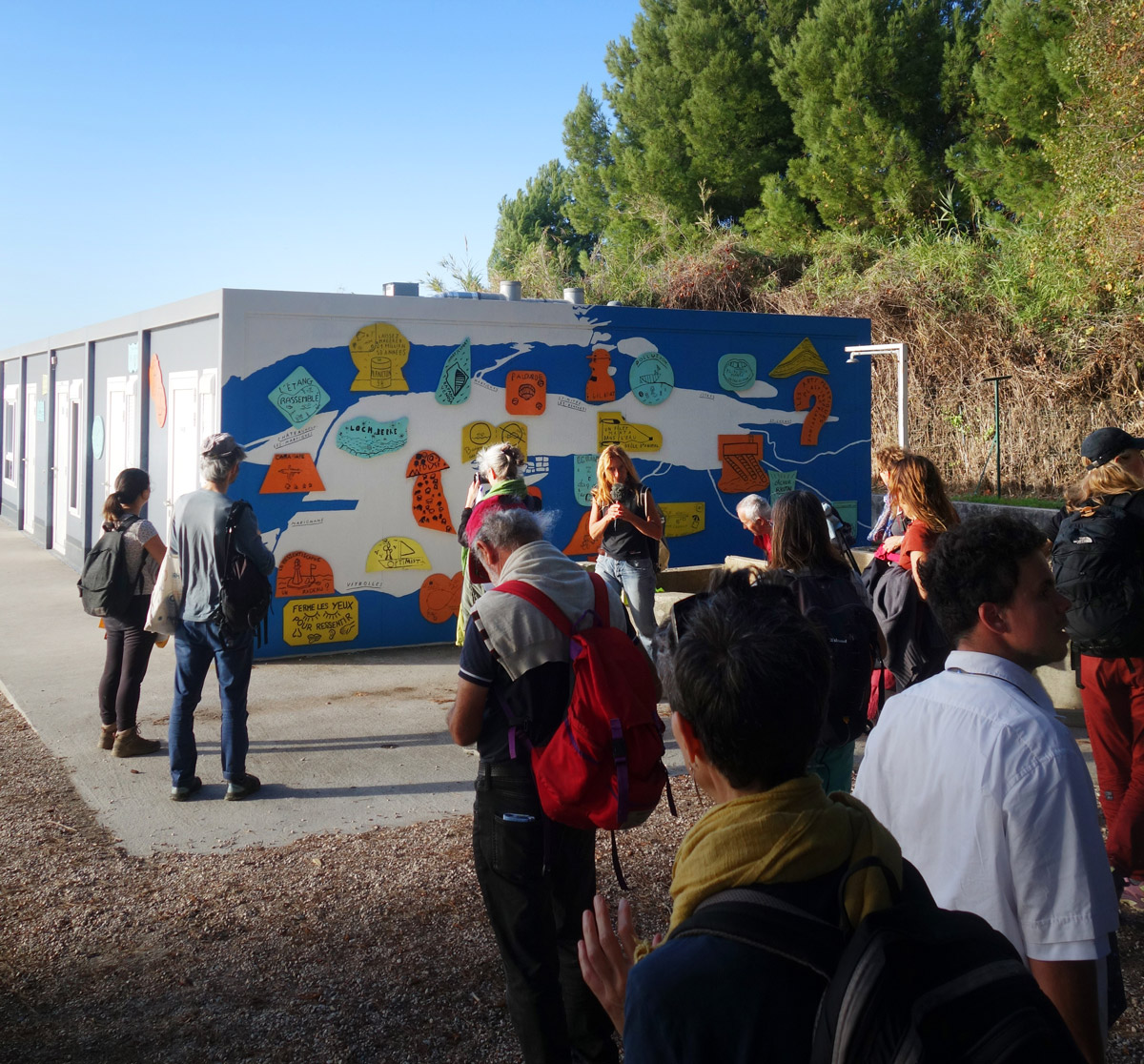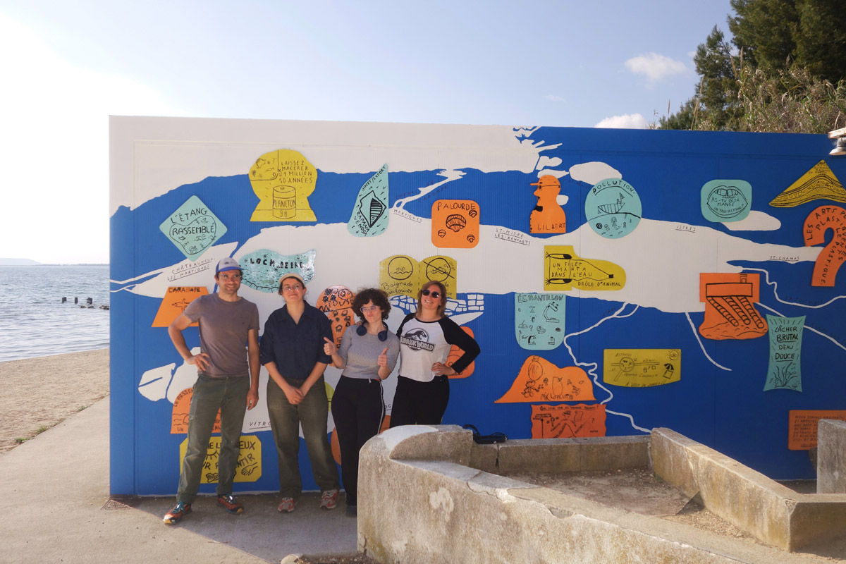 Je dessine une carte de l’étang avec une orientation est/ouest similaire au point de vue sur l’étang que l’on a depuis Vitrolles. La création des panneaux est participative, avec une moitié de panneaux dessinée par les enfants d’une classe de CE2 de Vitrolles après une matinée d’atelier découverte autour d’enjeu écologique propre à l’étang de Berre. L’autre moitié des panneaux est dessinée par les membres du Labo Plastique Pamparigouste (scientifiques, artistes et membres du Bureau des Guides) le temps d’un second atelier convivial. Quant au chantier de réalisation, il a lui-même était mené avec la participation d’habitant·es motivé·es.